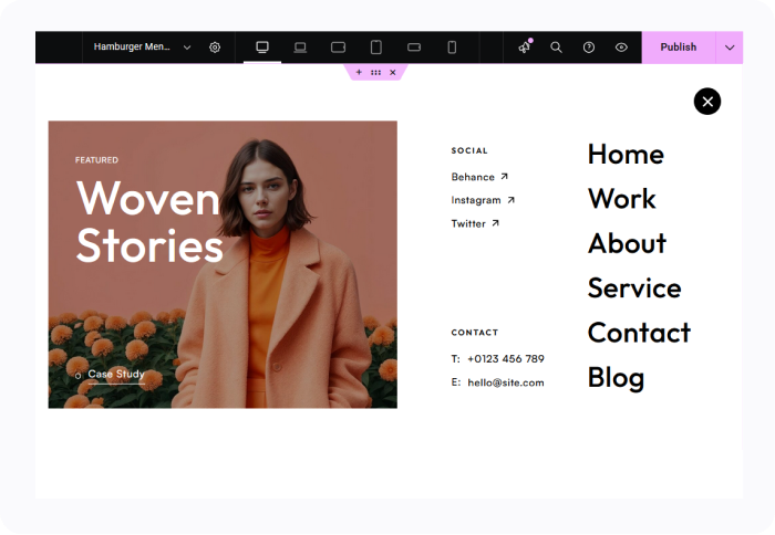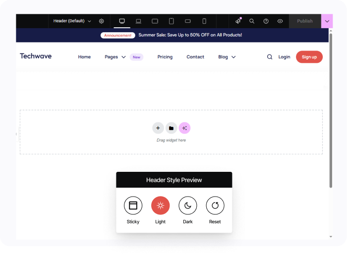 Craft a custom header that perfectly fits your brand. With Elementor drag-and-drop interface, you can choose from multiple pre-designed styles or create your own from scratch. You can create any style of header you need from sticky and transparent headers to hamburger menus, top bars, multi-row layouts, and much more.